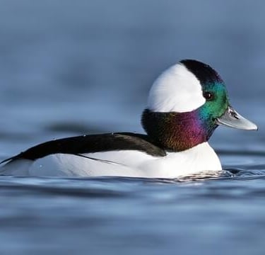 The Bufflehead is the smallest diving duck you'll encounter on Tampa Bay, and arguably the most visually striking. The drake is a bold black-and-white bird with an iridescent green-and-purple head patch that catches the light in a way that's almost electric when you see it up close on the water. Hens are dark brown with a neat white cheek patch.